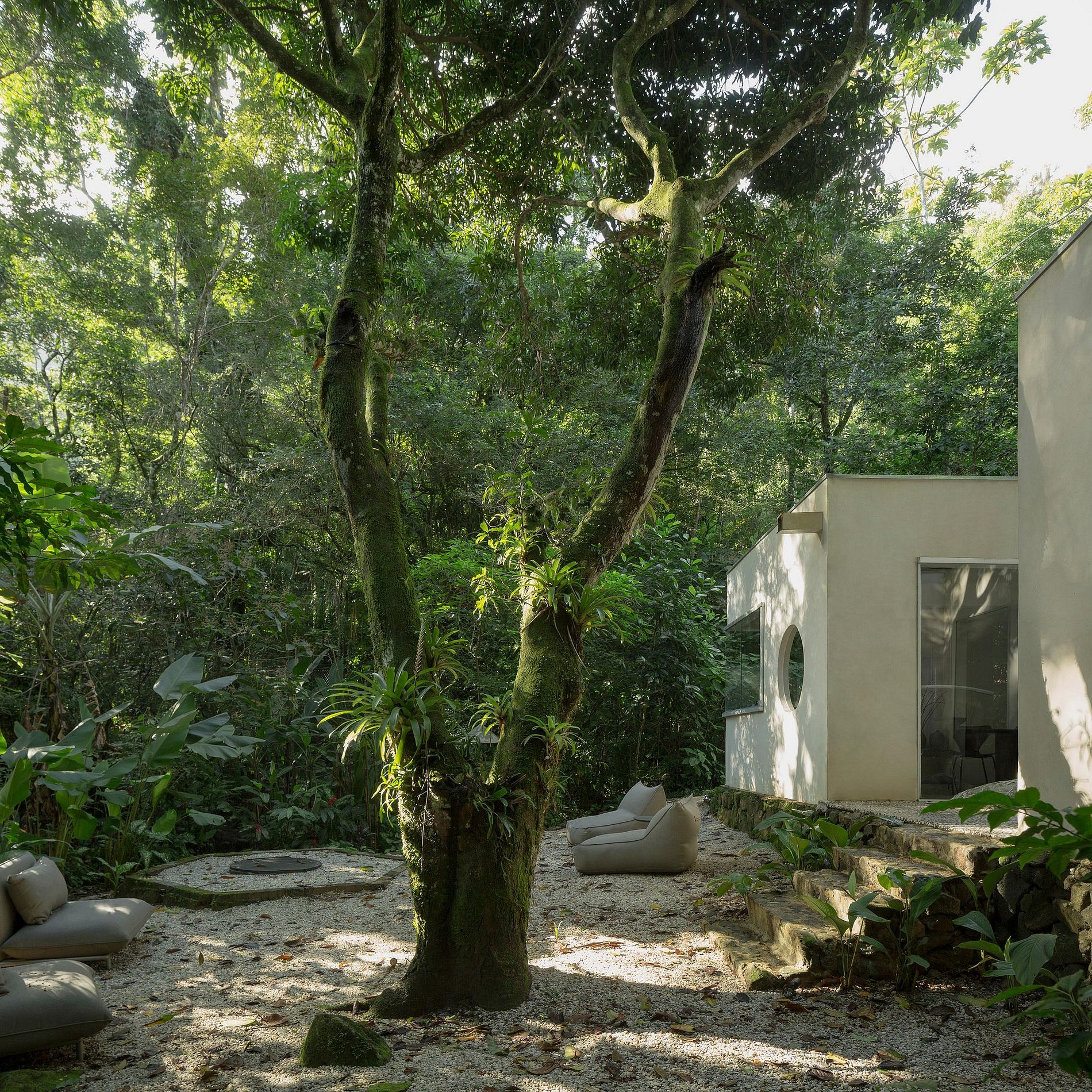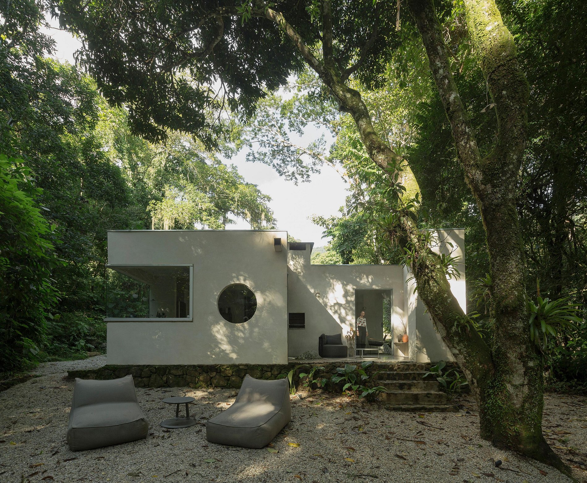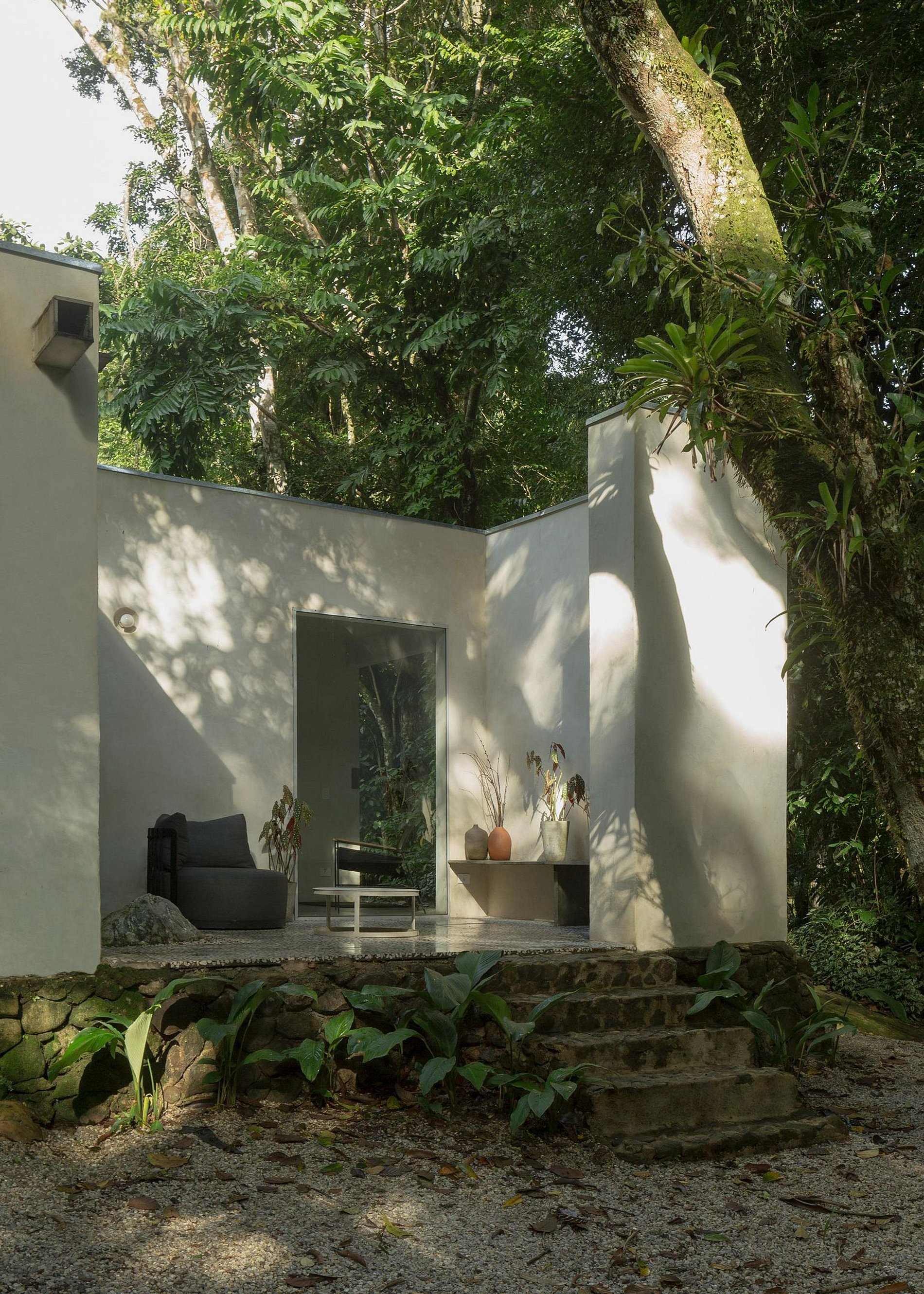 A Casa Pedra está localizada dentro de uma propriedade de mais de 10.000m2 murada no seu perímetro. Com um Rio privado e acessos a pequenas prainhas, cachoeiras e um exuberante jardim tropical. Na propriedade tem mais 4 casas, cada uma delas com a sua privacidade para o total conforto dos hóspedes. Dentro da propriedade tem trilhas e inclusive uma Igreja de estilo barroco, datada de 1978, construída por artesãos de Ouro Preto e com telhas da casa do escritor Monteiro Lobato, uma verdadeira viagem no tempo.