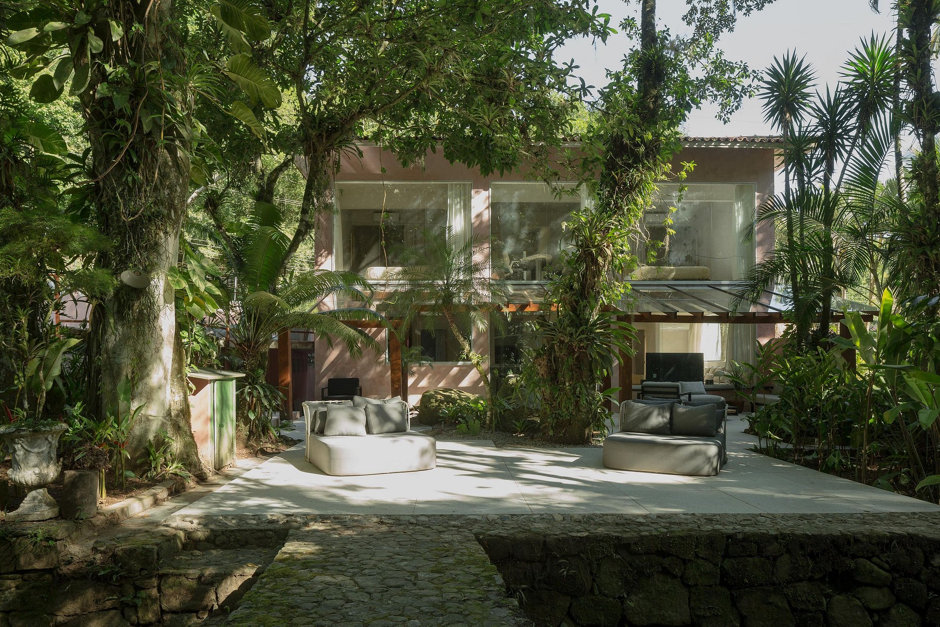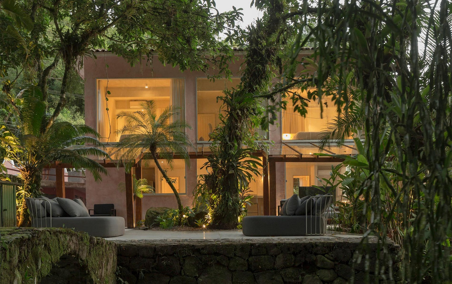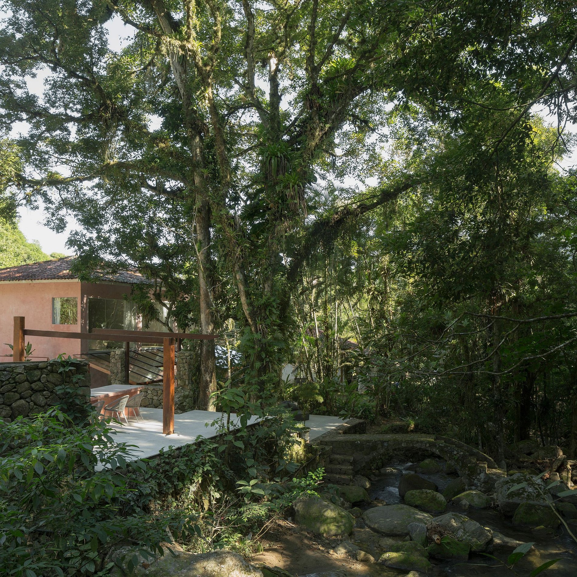 A Casa Rio está localizada dentro de uma propriedade de mais de 10.000m2 murada no seu perímetro. Com um Rio privado e acessos a pequenas prainhas, cachoeiras e um exuberante jardim Tropical.