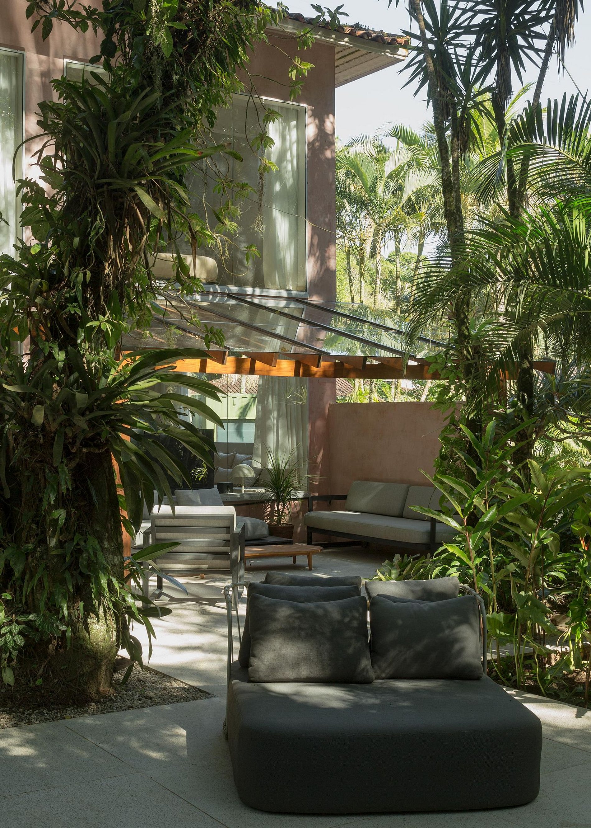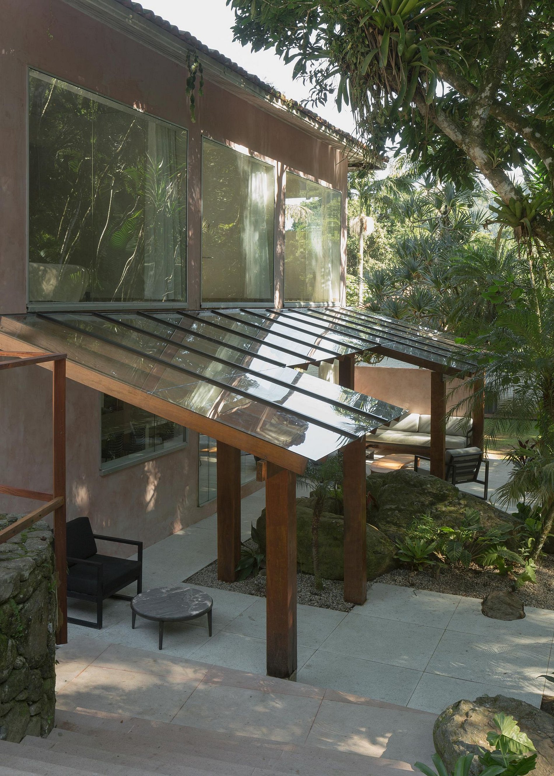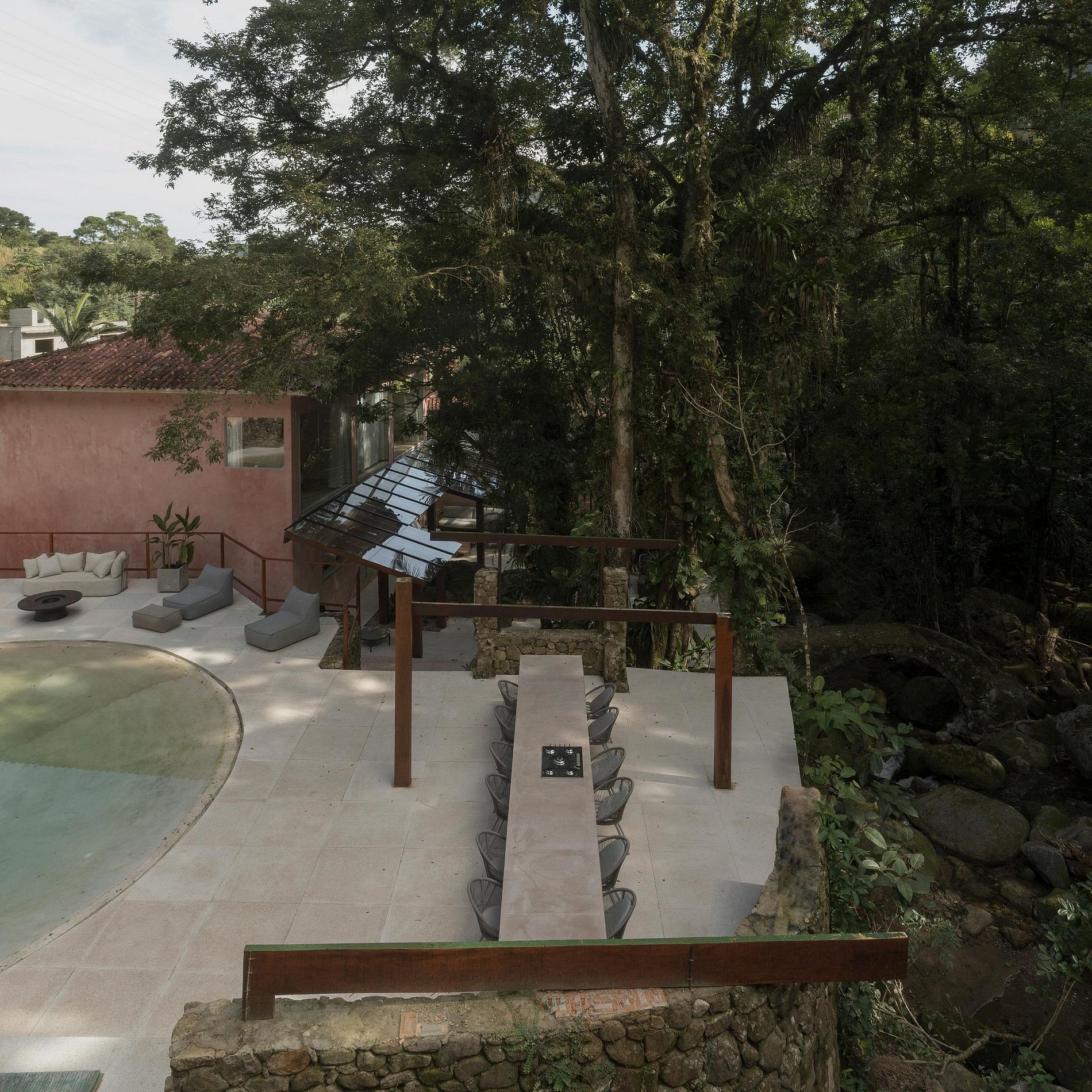 A Casa Rio está localizada dentro de uma propriedade de mais de 10.000m2 murada no seu perímetro. Com um Rio privado e acessos a pequenas prainhas, cachoeiras e um exuberante jardim Tropical.